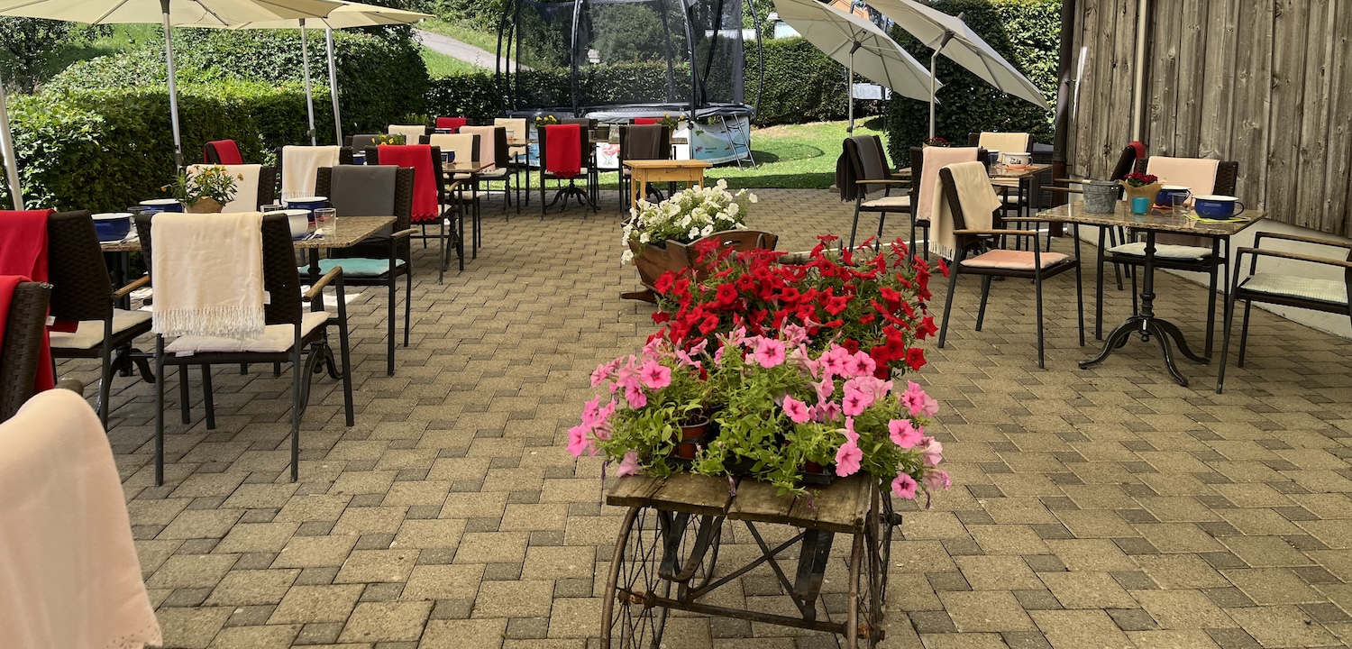 Unsere Gartenterrasse lädt ein zum Verweilen - die Sonne verlässt den Horizont im Sommer erst um ca. 21:30 Uhr und im Winter um ca. 17:00 Uhr. Also ist es an Sommer- und Herbsttage dort noch lange gemütlich und warm. Hier finden Sie kleinere und grössere Tische für ein Mittag- oder Nachtessen zu jeder Zeit. Oder Sie geniessen ein feines Dessert und einen Kaffee nach einer anstrengenden Wanderung vom Uetliberg - Felsenegg bis zu uns ins Chnuschper-Hüsli auf der Buchenegg.