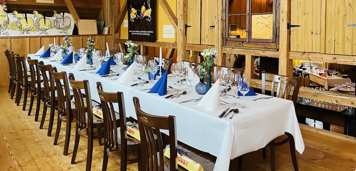 Auf der Hühner-Empore können wir für Sie eine Tafel herrichten für 16-24 Erwachsene Personen (Kinder sind erst ab 12 Jahren erlaubt). Hier sitzen Sie im Märchen von Witwe Boltes Hühner. Dieser Teil lässt sich verbinden mit dem Apéro Teil (Meister Müllers Bäckerei). Bei einer Trauung kann er bespielsweise genutzt werden als Empore für Brautpaare und den Zeremoniegestalter. Oder bei Firmenanlässe eignet sich die Empore hervorragend für Reden oder Ansprachen. Bei grösseren Apéros kann die Empore in den Apéro-Teil integriert werden.